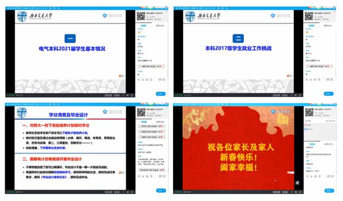 2月1日19时,在本科2018级家校沟通会上,谢力从2018级及往届毕业生基本情况、毕业去向类型、日常事务三个方面展开,向家长详细地介绍了2018级学生的整体情况。谢力讲到“在大三这个很关键的时刻,毕业去向是学生和家长共同的规划,不是单一的决定。”此次召开家校沟通会的目的就是引起家长对于学生毕业去向规划的重视,形成家校合力,与学生共同做好毕业选择的准备,根据自身的实际情况选择最适合自己的发展道路。最后谢力建议:“利用假期时间,认真思考,用坚定的信心、详尽的计划和强大的执行力做好就业准备、细致谋划自己的大学之路。”