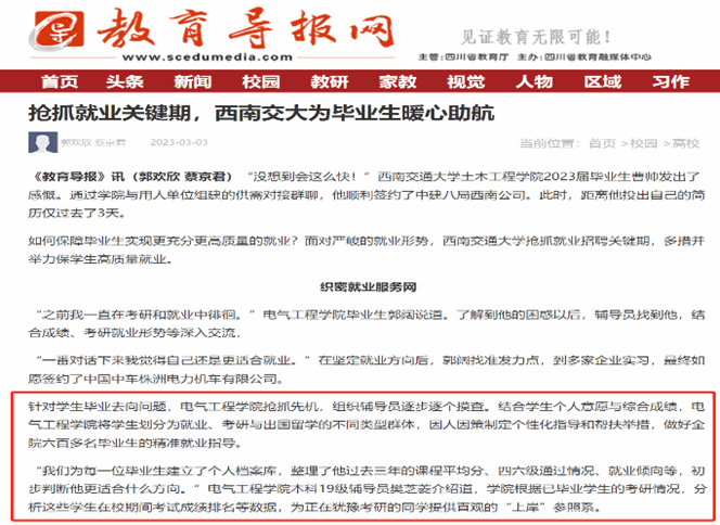 扎实的就业工作取得了突出的工作成效,学院在2023年就业考核中获评一等奖,就业工作在《教育导报网》、四川新闻联播《稳就业·一线调查》等媒体报道, 樊芝菱也先后三次获“西南交通大学就业工作先进个人(综合奖)”荣誉称号。